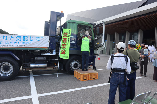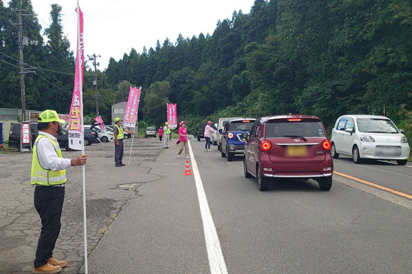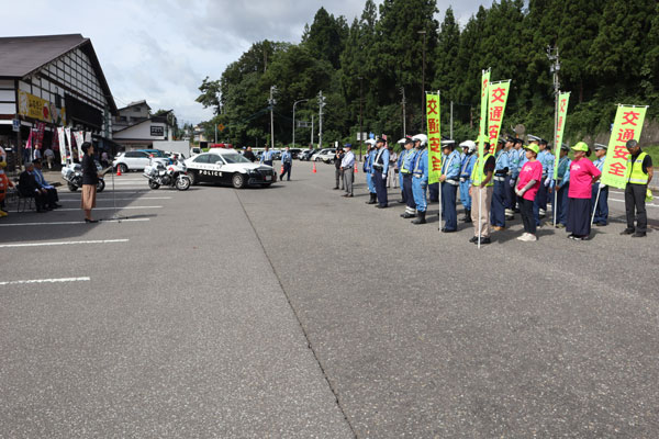 県境の道の駅「さかえ」にて、津南町長・飯山署・十日町署も協力して安全運転の呼び掛け