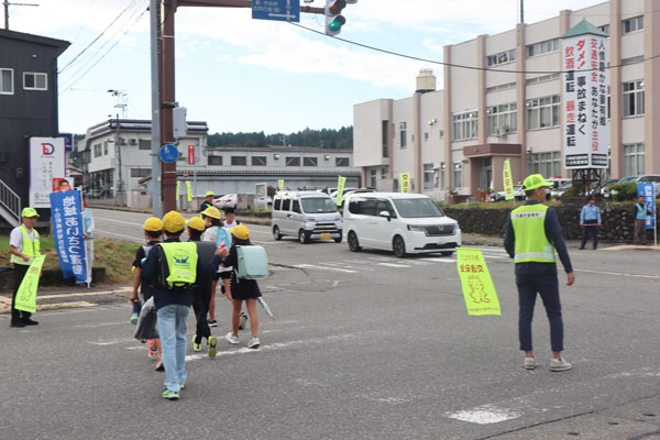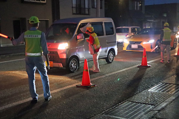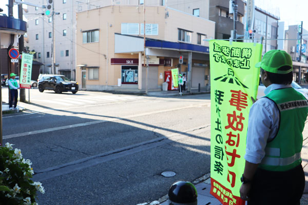 中里地域:「死亡事故ゼロを目指そう!」のぼり旗を持ち、朝の通勤時間帯に安全運転の呼び掛け