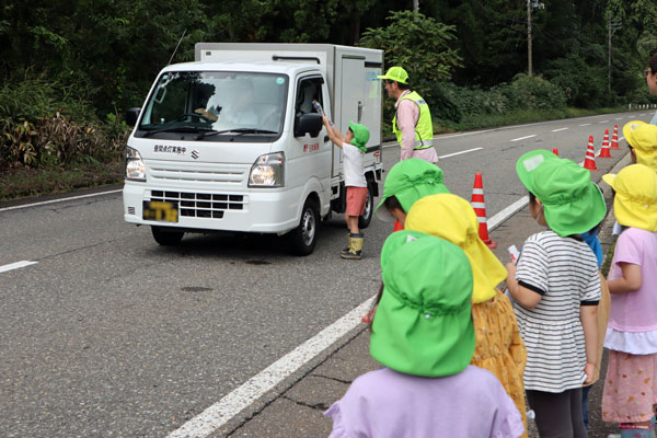 松之山地域:園児ら手作りの交通安全お守りを手渡して安全運転を呼び掛け